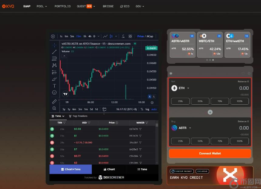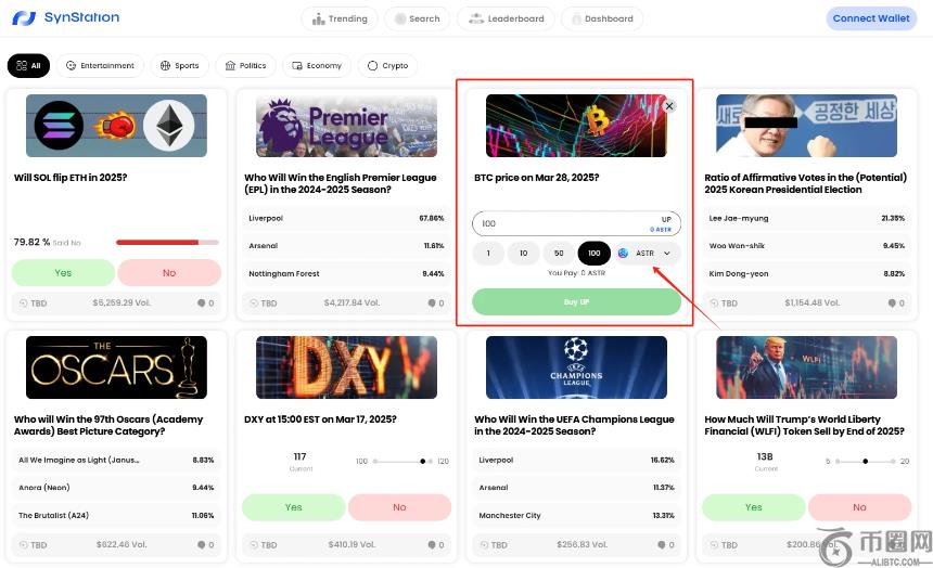 STEP 6. 进入交互网站(链接:https://app.kyo.finance/swap)后连接钱包,将 ETH 兑换成 ASTR,然后进入预测平台(链接:https://market.synstation.org/),随机选择一个进行下注,选择 ASTR 进行下注。
