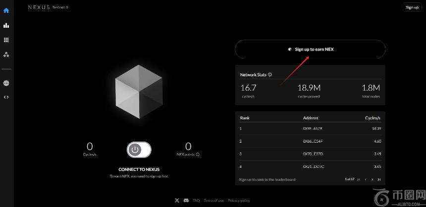 STEP 1. 进入交互网站(链接:https://app.nexus.xyz/)后,点击“Sign up to earn NEX”,通过谷歌邮箱进行登录。