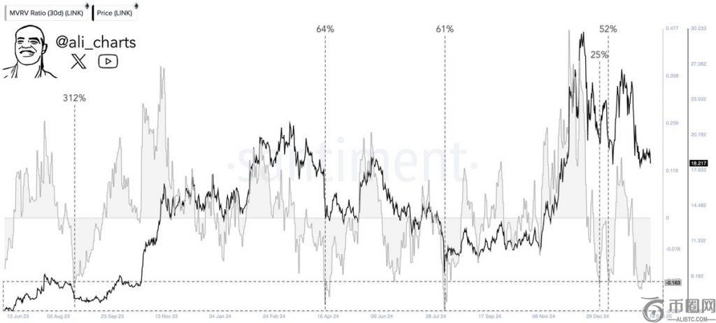 除了这种放缓之外,Link的价格也受到MVRV定量的影响。根据Analsyt的说法,衡量交易者盈利能力的MVRV比率也表明了这一下降。在过去30天中购买链接的个人的平均损失目前为16%。从历史上看,在此级别上已经确定了疲劳点。