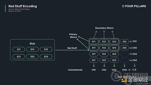 相比之下,Walrus采用Reed-Stuff Encoding,其成本显著低于Arweave和Filecoin,效率高达100倍(与Arweave相比,后者需要**存储数据,导致复制成本高达500倍,而Walrus仅需4-5倍复制即可保持**)。同时,数据丢失的概率也显著**。