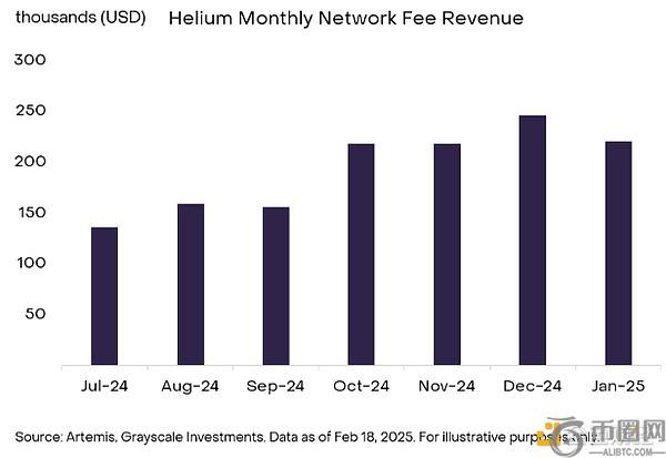 Helium 还与 T-Mobile 等电信提供商合作。通过这种合作关系,T-Mobile 用户可以在高流量区域无缝访问 Helium 的无线连接,从而减少拥堵并**成本。T-Mobile 根据使用情况向 Helium 网络付费,对 HNT 的供应产生通货紧缩影响。在很大程度上得益于企业的努力,Helium 已为大约 45 万人提供了无线互联网接入,并在 2025 年下半年实现了整体网络使用量的增加(图表 2)。[6]