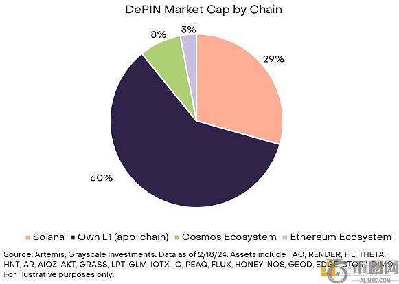 虽然许多 DePIN 项目选择构建自己的独立第 1 层区块链(“应用链”),但 Solana 已成为 DePIN 应用程序的主要区块链。按市值计算,Solana 是**的 DePIN 区块链,也是许多** DePIN 项目的**区块链(图 6)。一个值得注意的例子是 Helium,它最初建立在自己的第 1 层上,然后转移到 Solana。同样,视频转码网络 Render 和按市值计算的较大 DePIN 资产之一,于 2024 年从以太坊迁移到 Solana。在 Solana 上构建的其他 DePIN 项目包括 Grass、Hivemapper、io.net、Nosana 等。