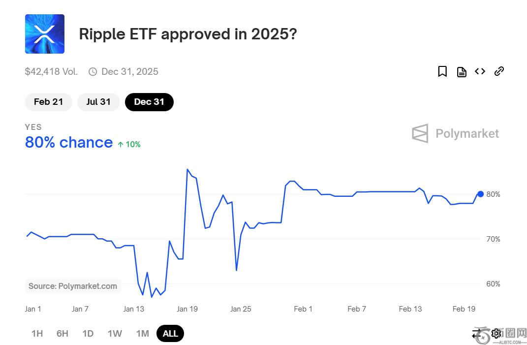 同时,XRP社区对今年至少一个XRP ETF的潜在推出保持乐观。根据Polymarket的数据,目前发生这种情况的几率目前为80%。