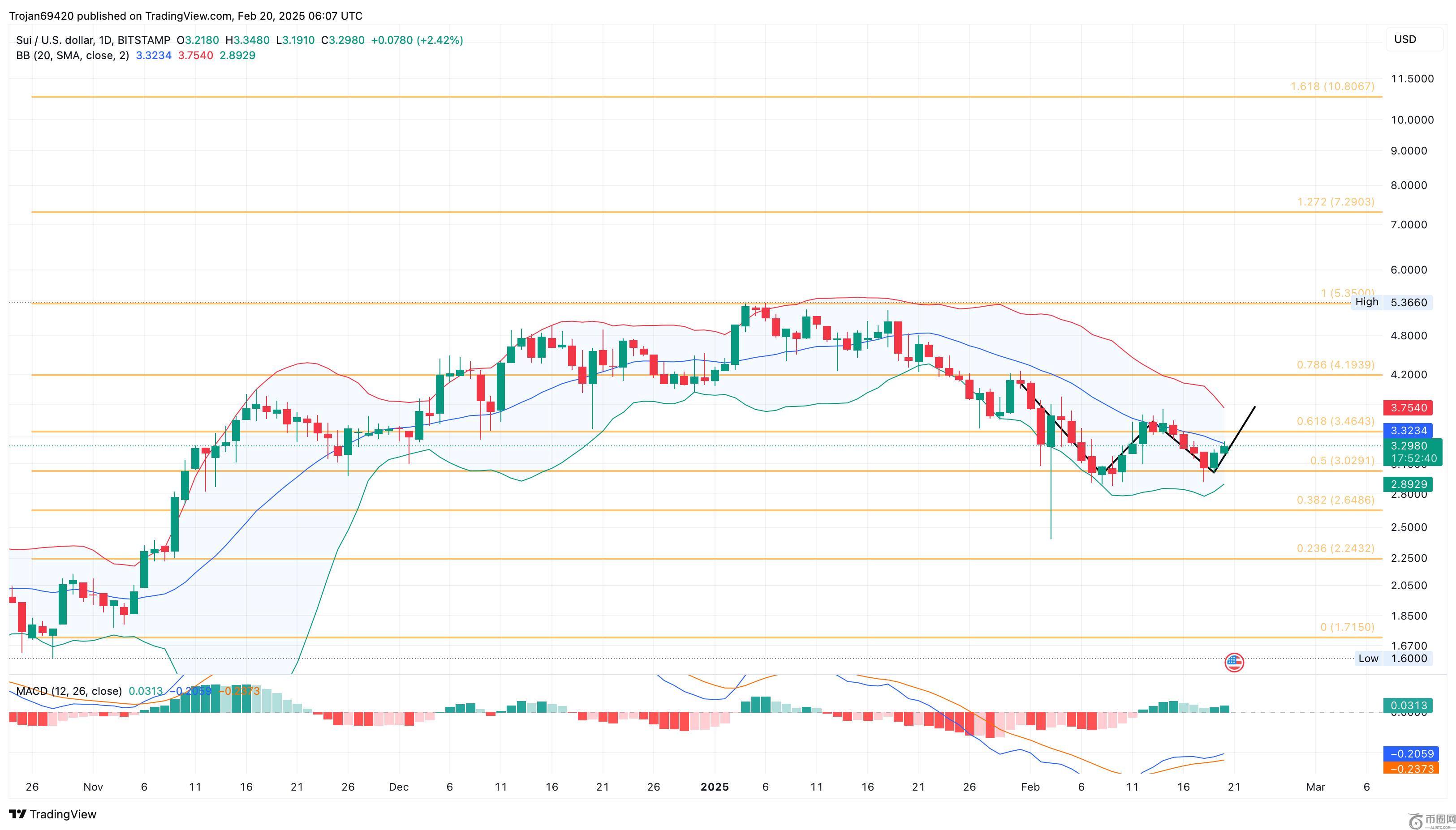 目前,SUI以3.29美元的市场价值交易,盘内回收率为2.36%。这是昨天5.19%跳的看涨延伸。