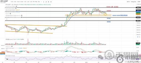 比特币昨天回踩了一下93000美元附近支撑,撑住后略有反弹,4小时周期K线进入反弹趋势,而实际上比特币日线整体仍在90000-108000美元这个大区间震荡,近期则需留意EMA20日线97600美元以及10万美元这两个压力位,只有收回这两个位置日线才能重回多头优势。