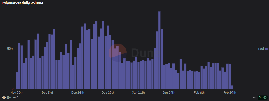 一月份最繁忙的日子在最繁忙的日子里,总体多头市场的量为7500万美元,降至3100万美元baseline level。一月份Polymarket看到超过347K的商人,比12月的44.5万人**了。现在,市场降至较低的基线水平,**赌注是NBA**,交易量超过1B。