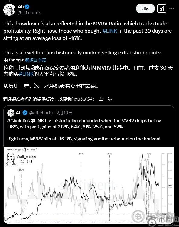 他指出,LINK 的 MVRV 比率(近期交易者的盈利能力指标)目前亏损 16%,从历史上看,这一水平预示着抛售压力将暂时缓解。