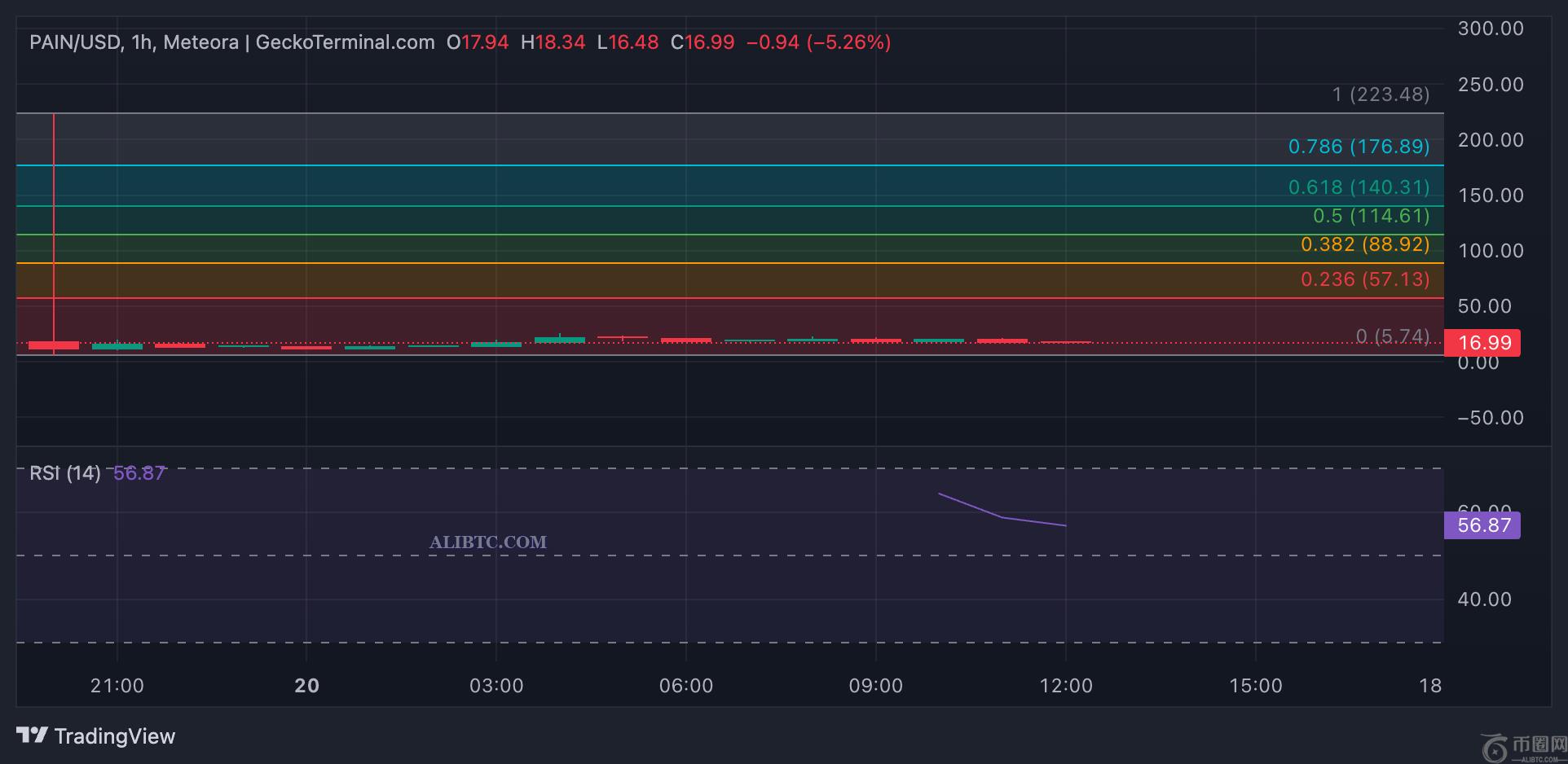 截至本文撰写时,该 meme 币的交易价格为 16.99 美元,过去 24 小时内价格下跌了 10%。小时图上相对强弱指数 ( RSI ) 的下降证实了对 PAIN 的需求下降。它处于下降趋势,为 56.87。