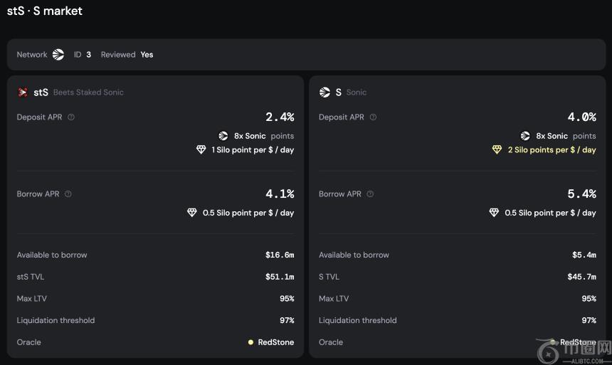 在Silo Finance上借入stS**,设定95%的LTV,实现20倍杠杆。随后将stS**质押,可获得2.4%的出借收益和5.3%的质押收益,叠加10%的积分奖励后,总APR可达74%。