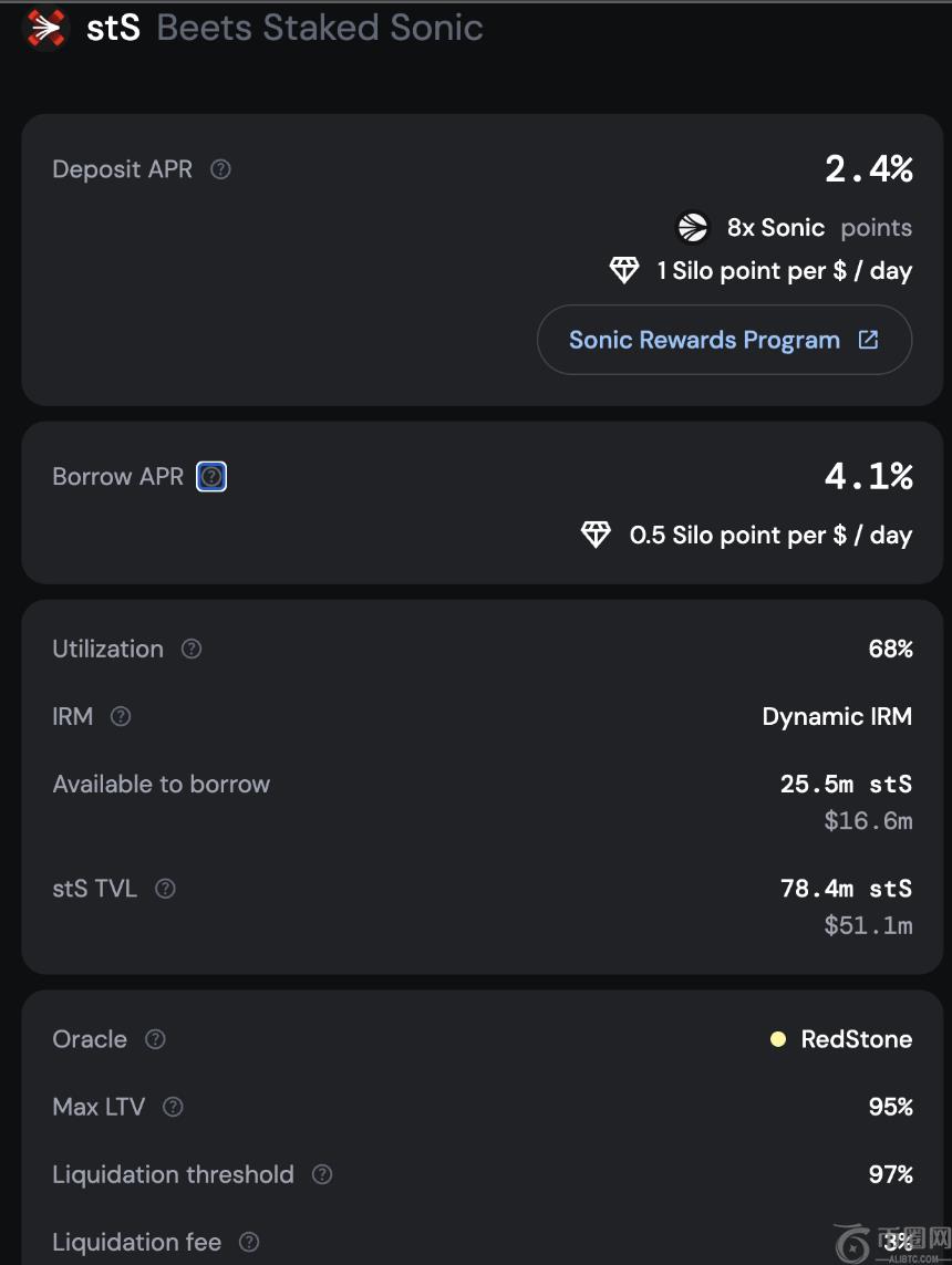 在Silo Finance上借入stS**,获取8倍积分加成,随后将stS**出借,获得4.1%的出借收益和每日0.5个Silo积分奖励。该策略虽然收益较低,但风险相对较小。