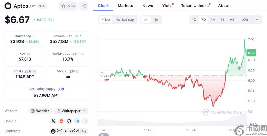 反观 Aptos,研究主管 Spiegelman 选择在测试网当天发起指控,或许有市场竞争的考量。尽管到底谁才是技术原创尚无定论,Aptos 这次选择在 Monad 收获**流量时发起进攻显然收获了成效。在社区吃瓜围观的过程中,Aptos 的原生** APT 表现出强劲的价格上涨。截至撰稿时,根据行情数据,过去 24 小时内 APT 涨幅达 7% ,短时触及 7 美元。