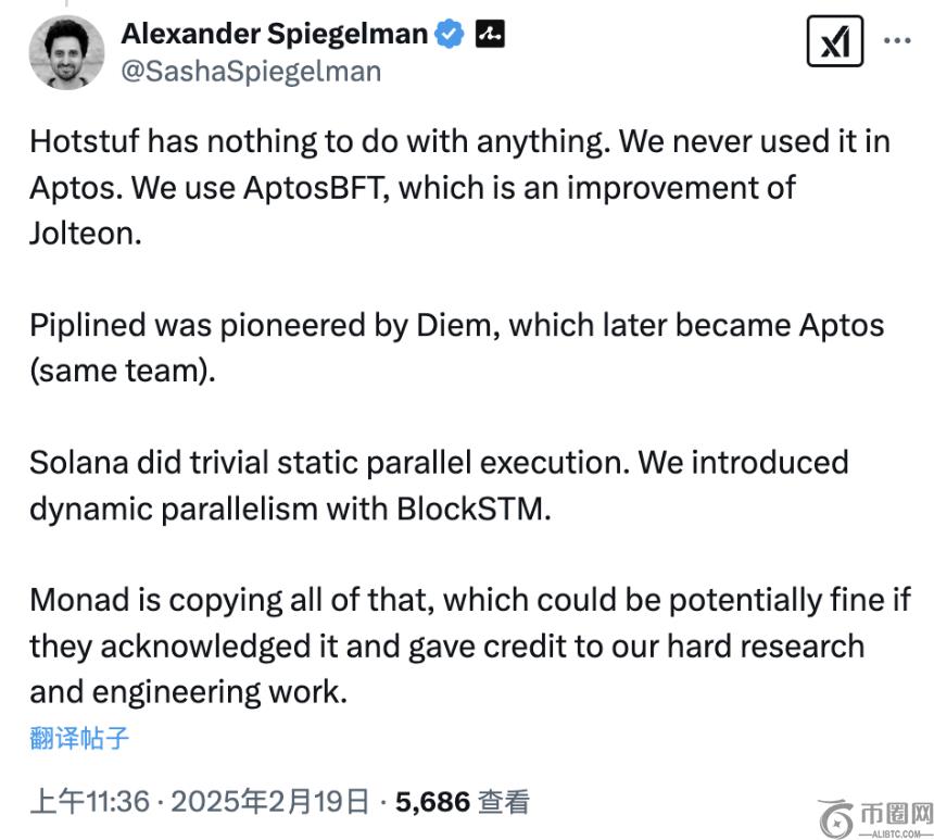 这次技术原创性之争,**由 Aptos 研究主管 Alexander Spiegelman 开火:「不明白为什么 Monad 要花这么多时间来抄袭 Aptos 的技术。这一切都是开源的,且已经有了许多经同行评审的论文,与其遮遮掩掩,还不如大大方方地直接抄袭。」