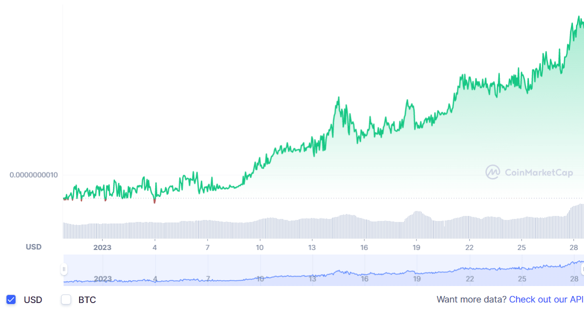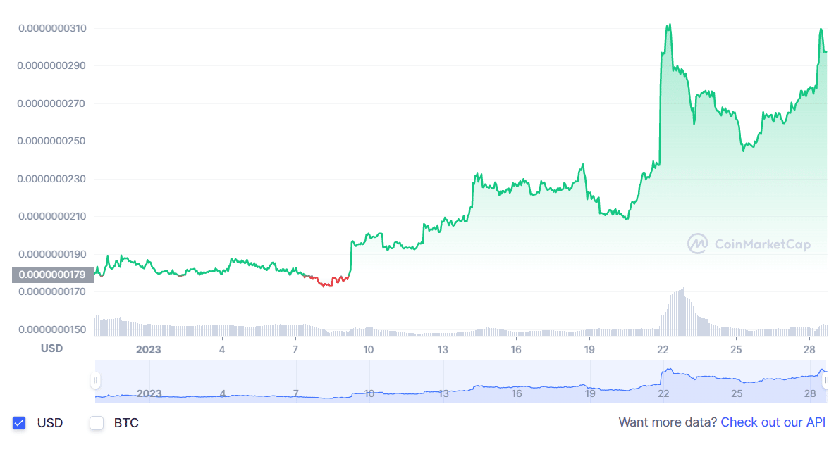 5 种**低价模因硬币列表中的下一个是 Shiba Predator。这个 meme 加密货币项目于 2022 年 3 月出现,据说是 Shiba INU (SHIB) 和 Dogecoin (DOGE) 的竞争对手。目前,Shiba Predator 的交易价格为 0.0000000297 美元,过去 24 小时内上涨了 7.55%。