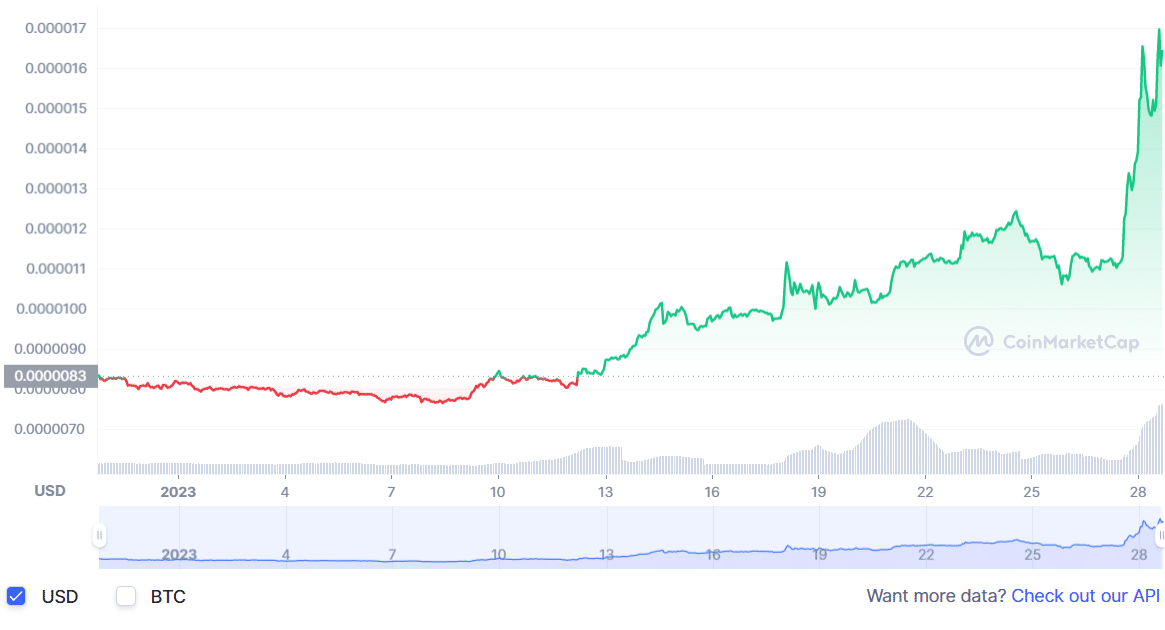 Floki Inu 是另一种以狗为主题的模因硬币,由 Shiba Inu (SHIB) 社区的粉丝和成员创建。它被认为是表现**的模因硬币之一,可用于被动收入。FLOKI 目前的交易价格为 0.000017 美元,24 小时交易量为 13,410,864 美元。它的价格在过去 7 天里几乎飙升了 50%。