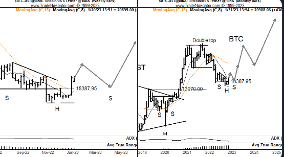 与此同时,资深交易员 Peter Brandt 分享了两张图表,分别是每周图表和每月图表,预测比特币价格将在 2023 年年中上涨至 65,000 美元。根据 Brandt 的说法,BTC 价格将达到 25,000 美元并见证修正至 18,000 美元。此后,可以见证至少 65,000 美元的反弹。不过,他也认为,在当前的市场条件下很难预测价格。