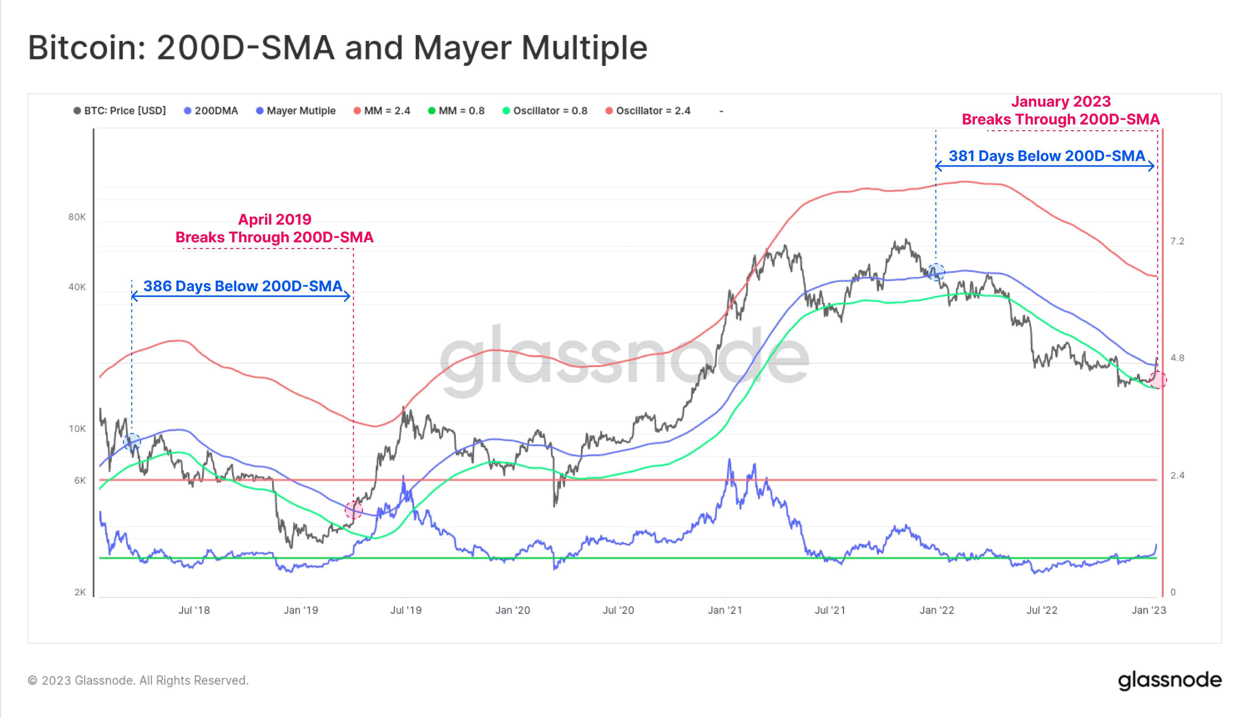 在 2018-19熊市中,比特币在 200 日移动平均线 (DMA) 下方交易了 386 天。考虑到上周的反弹,BTC 价格在 381 天后回到 200-DMA 上方。