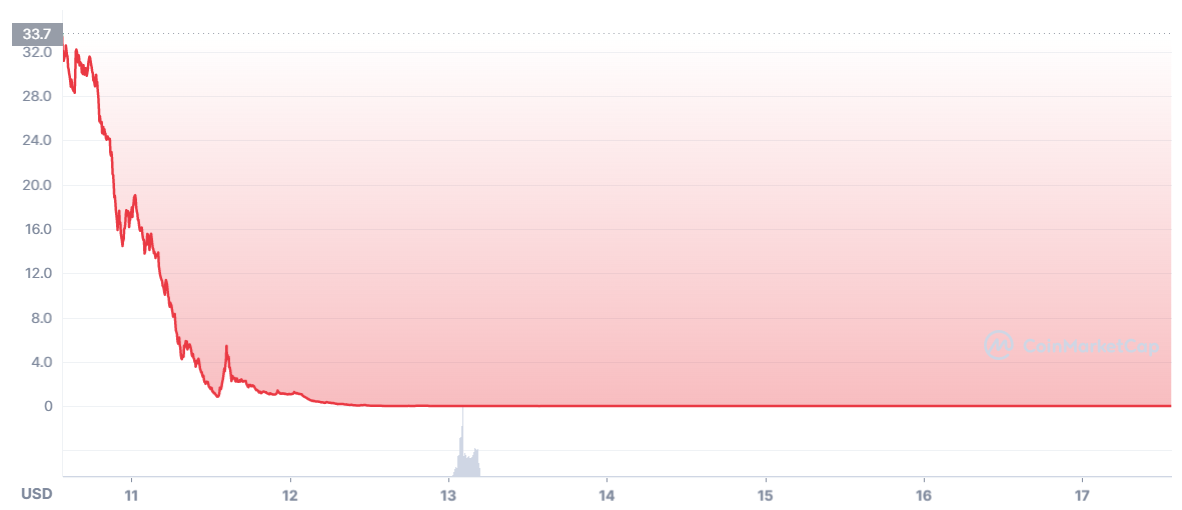 然而,LUNA 的下跌开始得更早——2022年5 月 6 日。3 天内,山寨币的价格从 87.15 美元跌至 60.14 美元。从 5 月 10 日到 11 日的短短 24 小时内,价格从 4 月的高点(119 美元)急剧下跌 98%。到第二天晚上,该**几乎跌至零,交易价格为 0.01 美元。