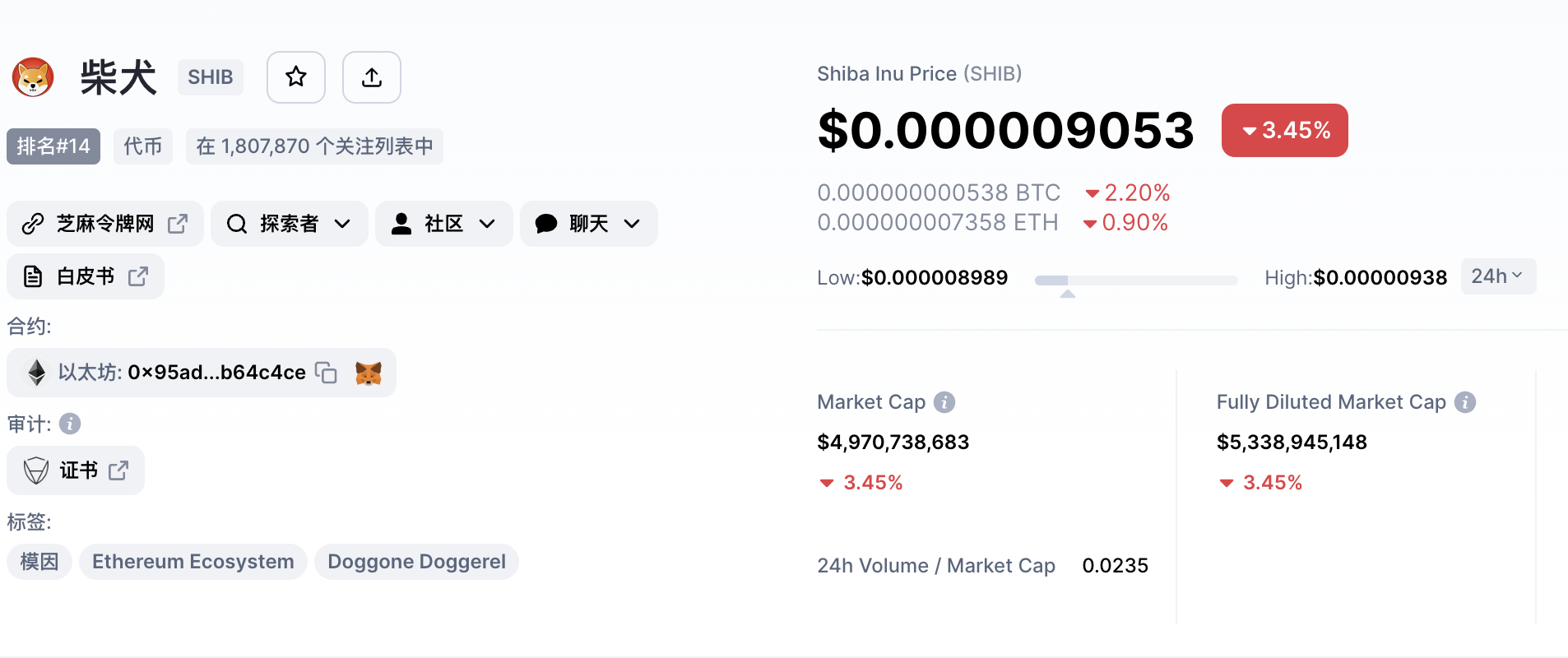 今日柴犬活价为 0.000009 美元,24 小时交易量为 116,938,979 美元。 我们实时更新 SHIB 到美元的价格。 Shiba Inu 在过去 24 小时内下跌了 3.45%。 当前 CoinMarketCap 排名第 14,实时市值为 4,970,738,683 美元。 它的循环供应量为 549,063,278,876,302 个 SHIB 硬币 ,**。供应不可用。
