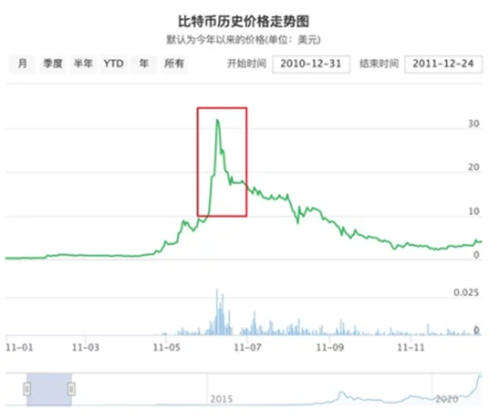 2011年4月-6月,只用了2个月时间,BTC先从0.68美金的价格飙升到30美金周边,《时代周刊》、《福布斯》等新闻媒体都陆续发布了有关比特币的文章内容。