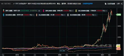 图中能够得知,2021年刚到3月中下旬,原油下跌10%,黄金和白银各自上升了44%和72%,但BTC再度期内却上升了754%,盈利令人震惊,远远地把其他投资种类甩在了后面。