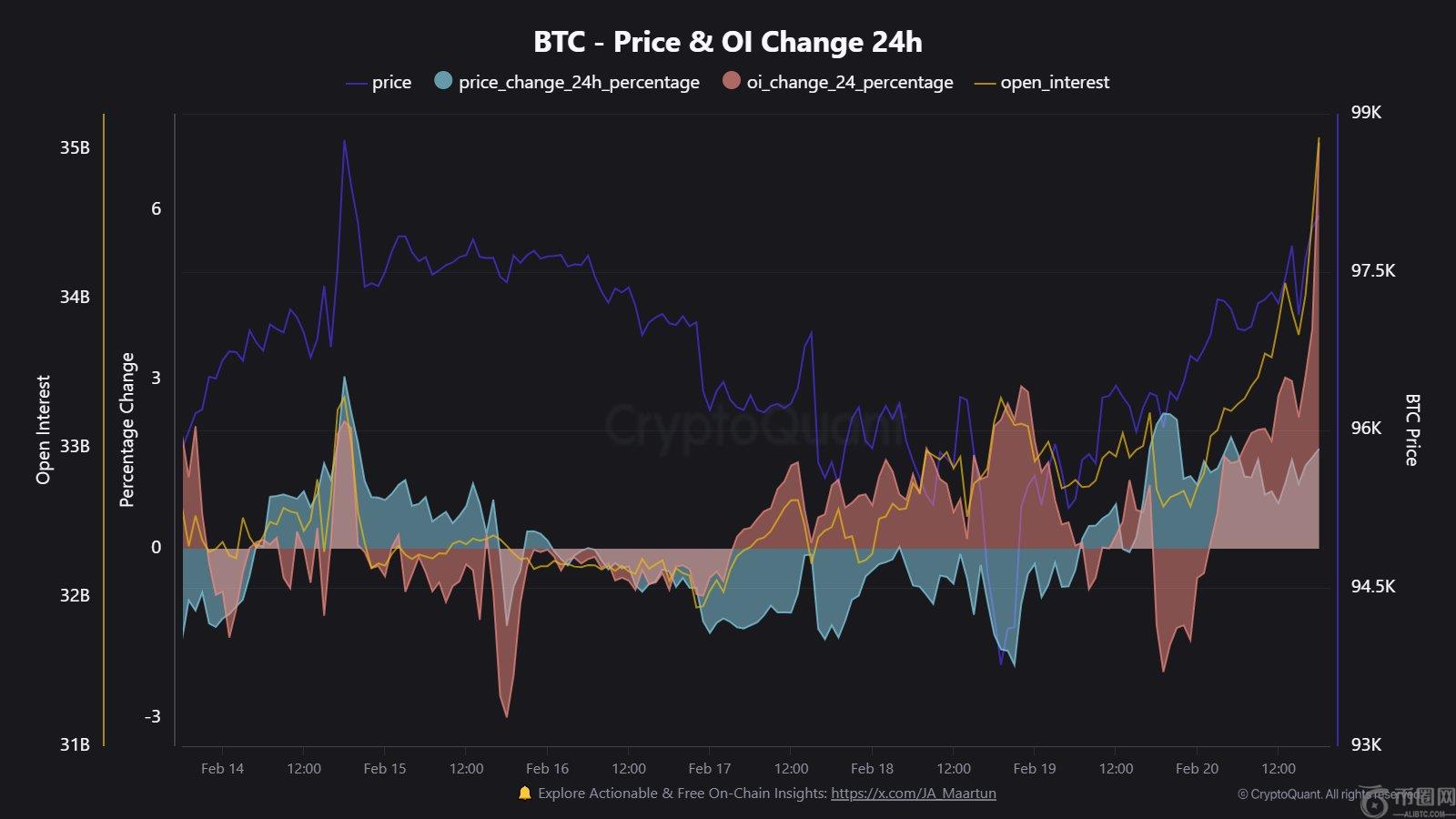 在过去的24小时内,开放利息(OI)增长了24亿美元,反映了7.2%的增长。这次激增已将开放兴趣恢复到近350亿美元。