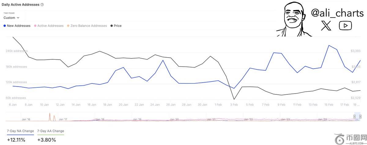 在上周,每日活跃地址增长了12.10%,超过200,000。