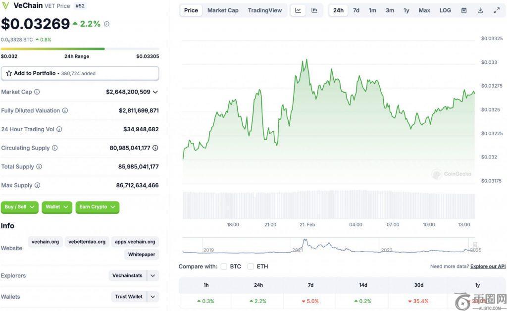 在最近的市场下跌之后,Vechain(VET)似乎正在恢复。该资产在每日图表中已增加2.2%,在14天图表中占0.2%。尽管恢复了,但每周图表中的资产下降了5%,每月图表中的资产下降了35.4%,自2024年2月以来,资产下降了23%。