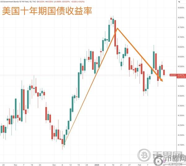 与美元类似的还有美债。在特朗普胜选后,一度有非常多的市场声音称“美国通胀要来了”,十年期美债收益率一度快速拉涨60个基点。但在过去一个月里,贝森特的财政部明确表示短期内维持债权拍卖规模稳定,叠加“政府效率部”大肆削减开支的举动,缓解了市场对联邦赤字问题的担忧。
