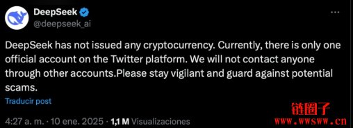 而目前 DeepSeek 官方也多次发出声明,呼吁用户注意**。先前 DeepSeek 于 1/10 在推特表示:「DeepSeek 并未发行**加密货币,目前**一个官方帐号,请用户务必提高警觉,以避免受骗。」