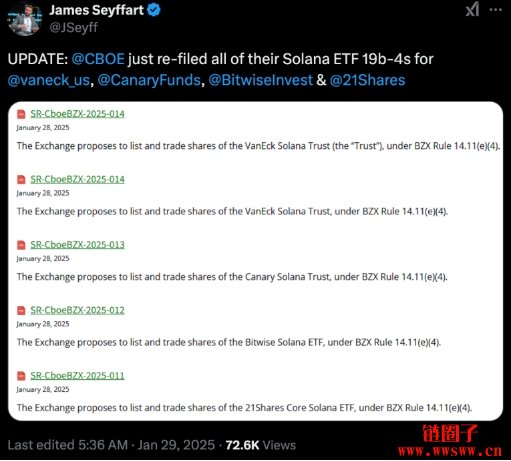 与此同时,Cboe BZX 交易所于也再次提交 19b-4 申请文件,推动 Solana 现货 ETF 的上市,包括 Canary Solana Trust、Bitwise Solana ETF、21Shares Core Solana ETF 及 VanEck Solana Trust 四家机构的产品。