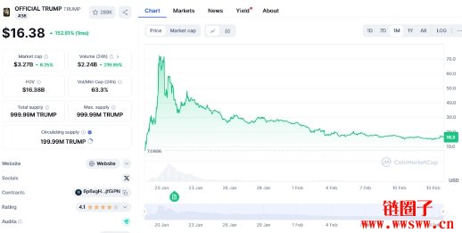 迷因币$TRUMP在推出数天内狂升,但之后就暴跌(CoinMarketCap网站截图)