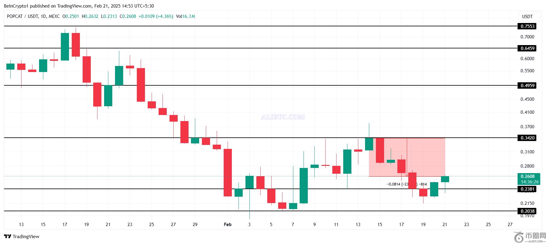 POPCAT 仍有可能跌至 0.20 美元,因为过去的表现表明该**难以维持复苏。从历史上看,当它无法从关键支撑位反弹时,它通常会回落到这些水平来恢复。