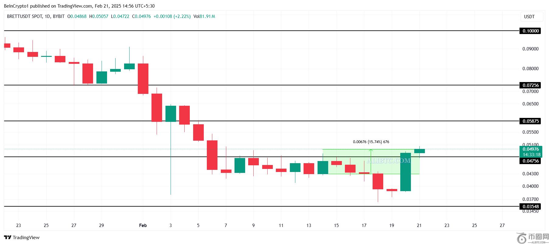 BRETT 是少数** meme 币之一,它逆市场大势而行,上涨 15.7%,交易价为 0.049 美元。这一上涨标志着山寨币的积极转变,表明如果有利条件持续,它可能会继续获得动力。