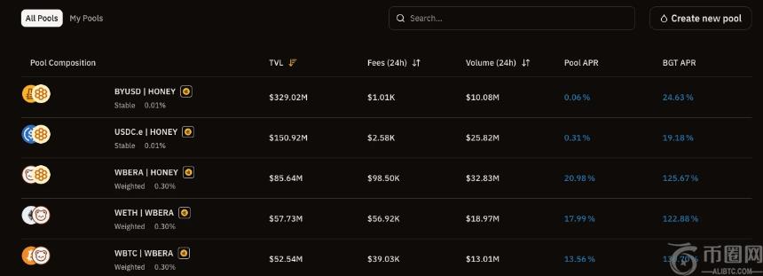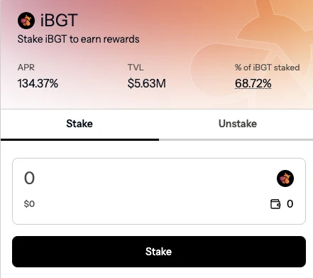 此外,iBGT可在Infrared再次质押,APR达134.37%。目前已有超过68.72%的iBGT被质押,TVL达563万美元。