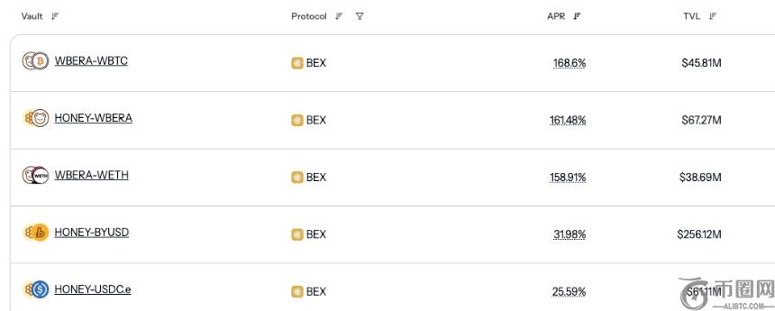 截至目前,Infrared的TVL达15.3亿美元,支持质押BEX LP收据**赚取iBGT的金库中,WBERA-WBTC金库的APR**,达168.6%。结合BEX流动性池本身的APR,WBERA-WBTC和HONEY-WBERA的综合收益率均接近180%。