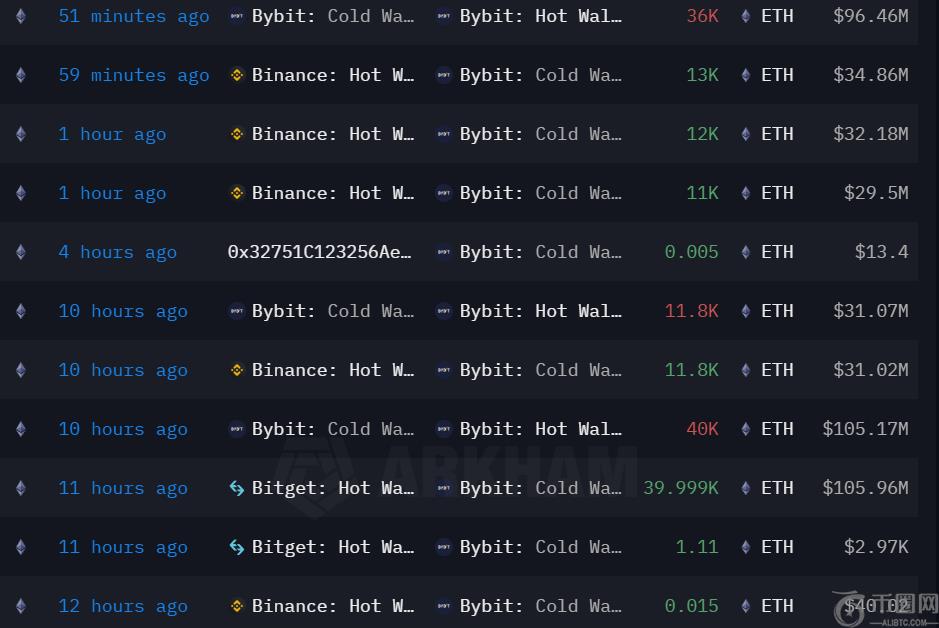 值得注意的是,阿**数据表明,Bitget将40,000 ETH(1.06亿美元)(占其所有以太坊持有量的四分之一)转移到2月21日的19:44(UTC)到Bybit Cold Wallet。市场情报公司Lookonchain建议交易所将资金转移到BYBIT,以提供更多的流动性来支持客户提款。