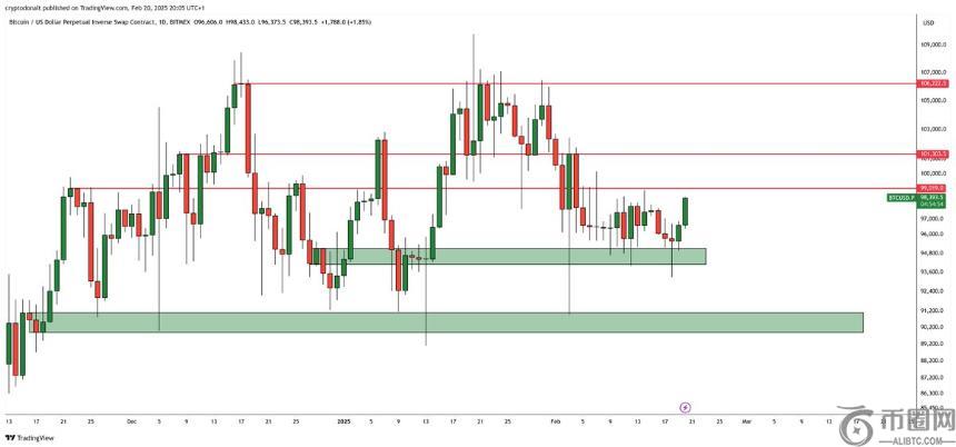 “我们喜欢目前的市场表现。这就是为什么我一直建议保持冷静的原因。每天需要三个完整的蜡烛图来扭转市场情绪。对我来说,99,000至101,000美元是新历史高点之前的**阻力位。一旦突破,我们将再次迎来上涨。”