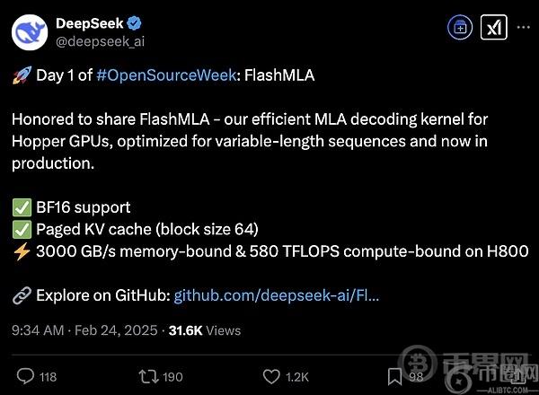 文章标题:“源神”DeepSeek 突破H800性能上限 FlashMLA重磅开源 算力成本还能降