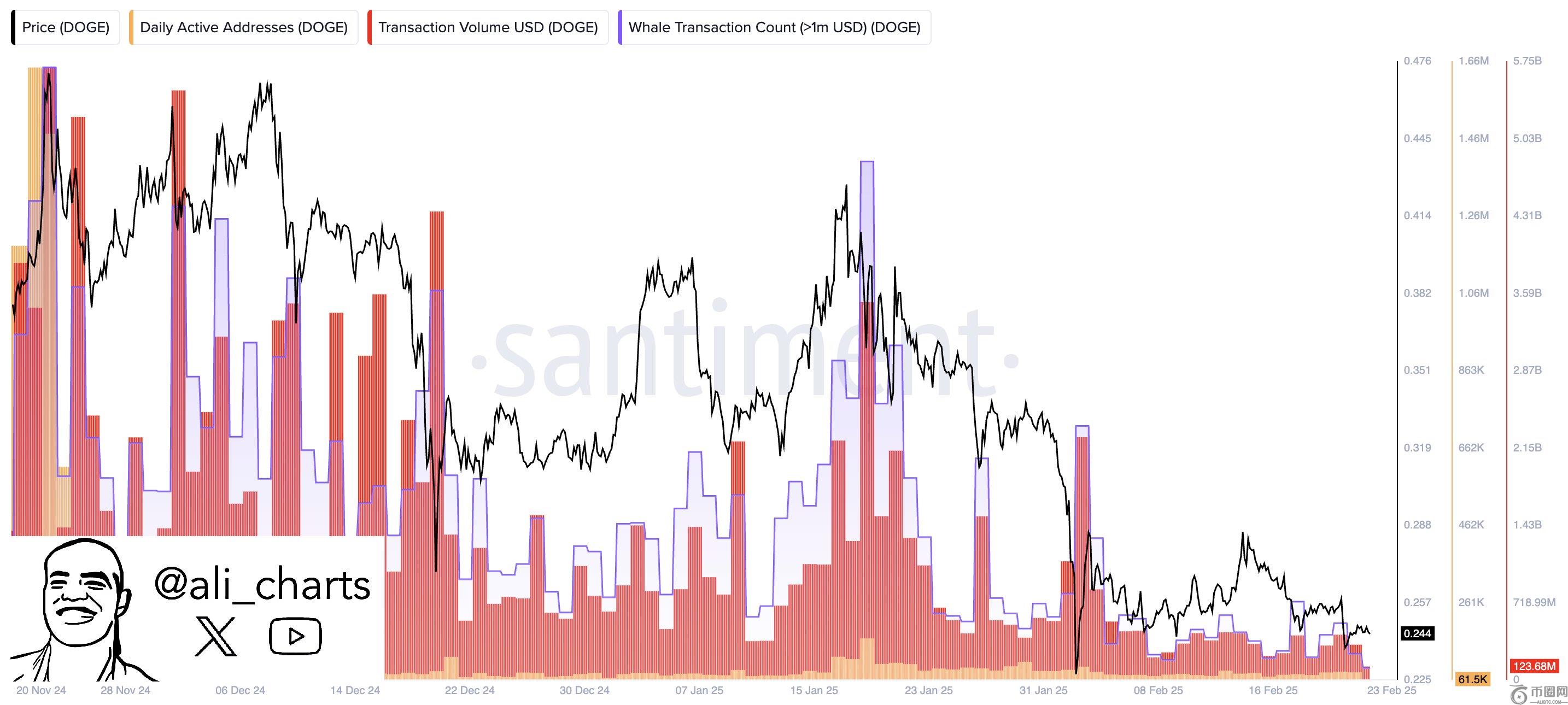加密分析师阿里·马丁内斯(Ali Martinez)在支持下行方案的情况下指出,Dogecoin的网络活动已下降到几个月来的**水平,从而达到了自2024年10月以来未见的数字。