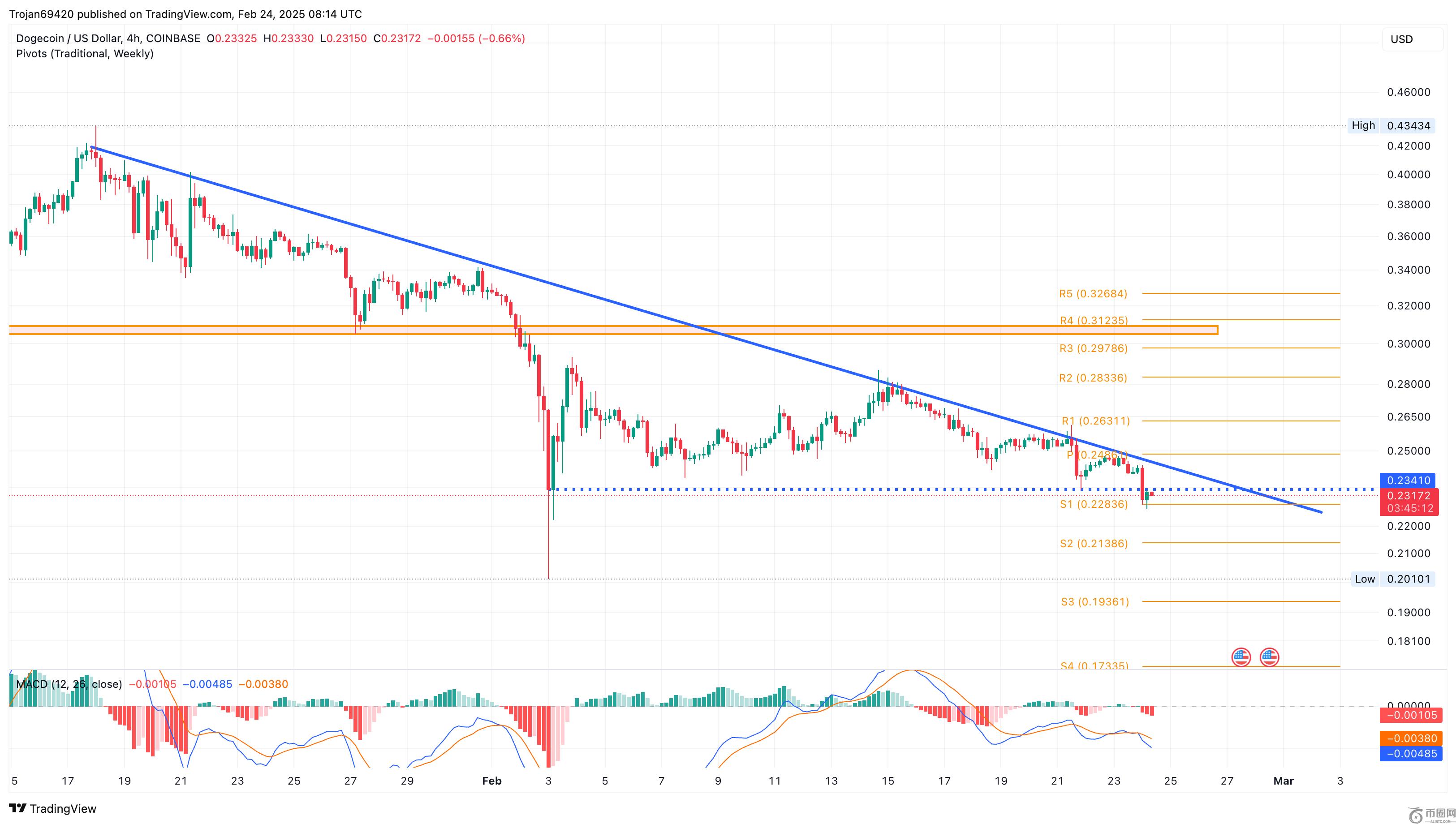Dogecoin的新7天低点为0.22644美元,标志着降落的三角形模式崩溃。在销售压力增加的情况下,MACD和信号线见证了一个急剧下降,负面直方图激增。
