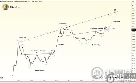 尽管今日市场表现**,但分析师“加密货币巨头”在社交媒体平台X上表达了对未来的乐观态度。他指出,“山寨币的回归将是传奇性的”,并引用看涨的市值图表形态,暗示市场可能在未来迎来反弹。