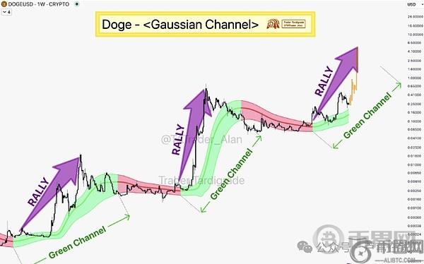 根据Trader Tardigrade的分析,DOGE在2024年进入了高斯通道的绿**域,尽管近期价格有所回调,但仍保持在这一区域内。这表明,DOGE的长期上涨趋势依然活跃,市场可能在短暂调整后恢复上涨。