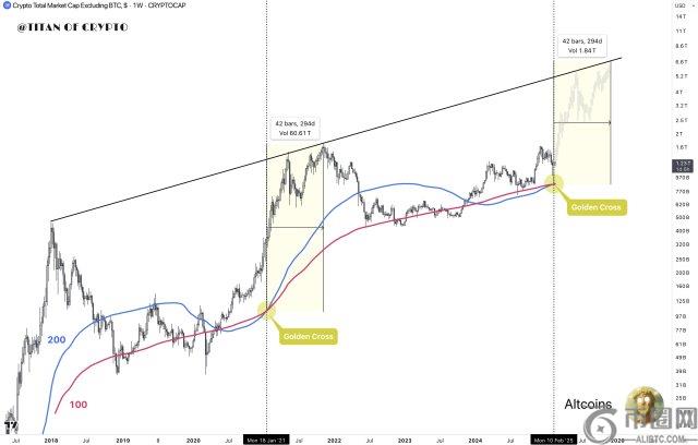 重要的是要注意,这个十字架是自2021年**季度以来的**个实例。突出显示这是**一次发生的山寨币在接下来的几个月中,市值增长了500%以上。
