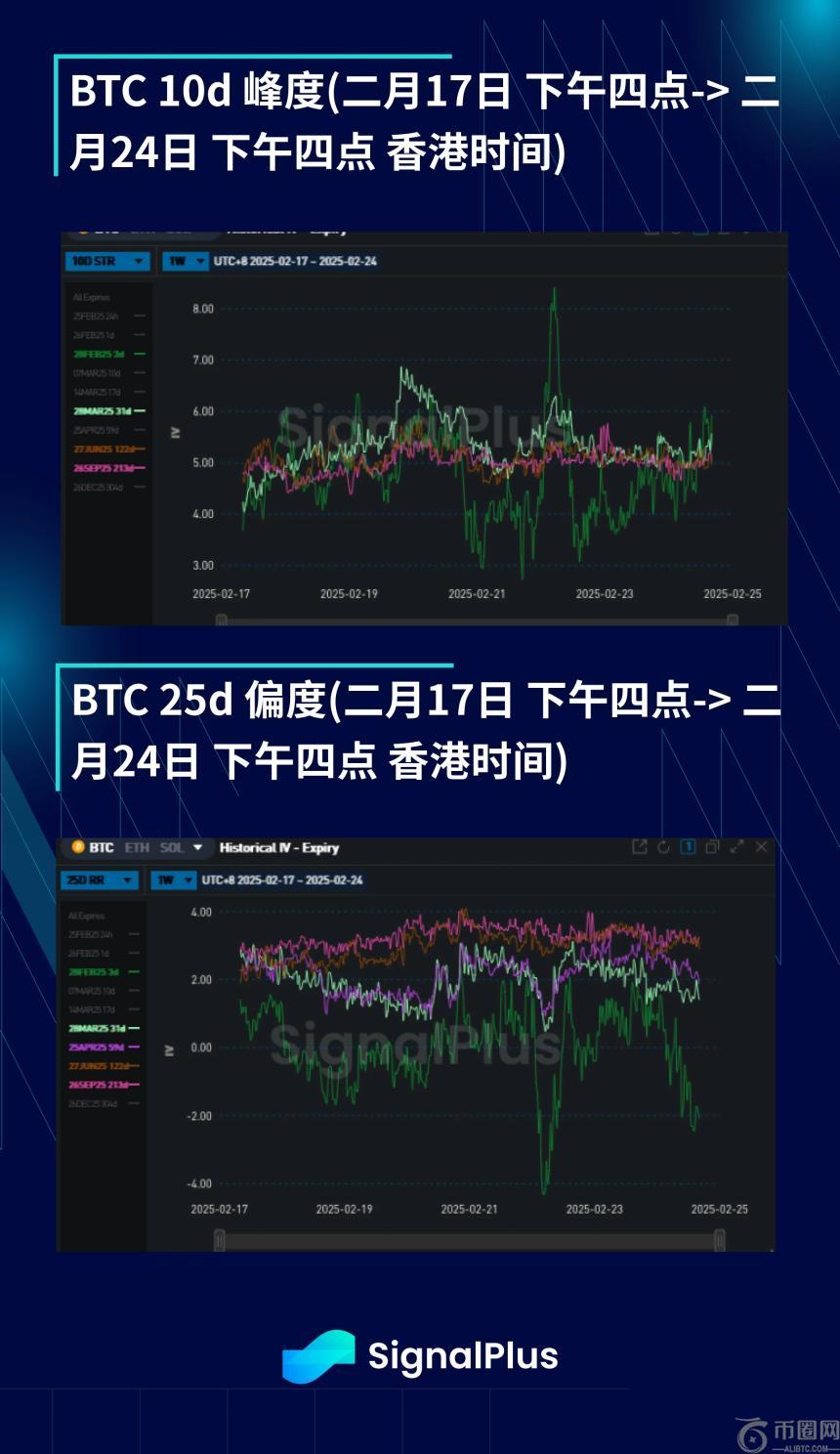 本周隐含波动率走势低迷,特别是2月至3月的到期日。Theta消耗和期限曲线上隐含波动率不断滚低,导致看涨波动率的头寸缴械投降。实际波动率近期持续锁定在30几的水平,将日均隐含波动率压低至35-36,为自去年大选前10月以来**水平。在币价仍固守在94,000-99,000美元范围内时,局部实际波动率难以大幅抬高,这将持续对短期隐含波动率施加压力。
