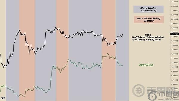 根据市场分析师“Mark”在 X(前身为 Twitter)上的一篇文章,下图中的黑线显示,鲸鱼越来越多地积累了这种山寨币,而散户投资者则出于对市场的恐惧和不确定性而抛售这种 meme **。