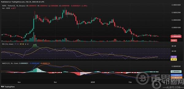 下面的 PEPE 日线图显示,相对强弱指数的值为 37.33,这表明空头目前控制着 meme **的价格走势。