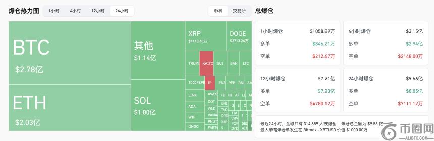 衍生品数据方面,Coinglass数据显示,过去24小时**爆仓金额高达9.56亿美元,其中绝大部分为多单爆仓,数额达8.85亿美元。从币种来看,BTC爆仓金额为2.78亿美元,ETH爆仓金额为2.03亿美元。