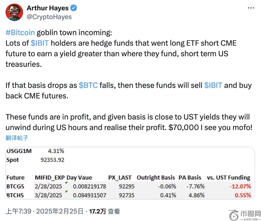 自1月末便开始“唱空至70000”的BitMEX联合创始人Arthur Hayes再次发表了自己的分析。Arthur指出,许多IBIT持有者是对冲基金,他们通过做多ETF、做空CME期货来赚取高于短期美国国债的收益。如果BTC价格下跌导致基差缩小,这些基金将卖出IBIT并买回CME期货。目前,这些基金处于盈利状态,考虑到基差接近美国国债收益率,它们将在美国交易时段进行平仓,兑现利润。总之,Arthur强调将继续看跌比特币至70000美元。