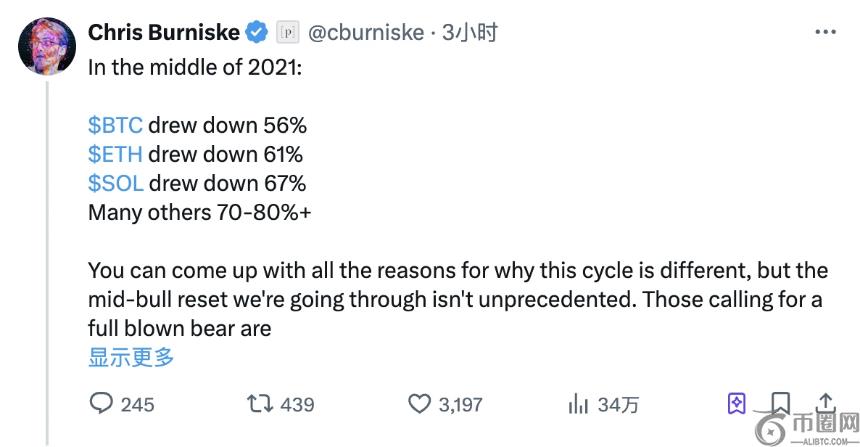 另一位影响力颇大的机构大佬、Placeholder合伙人Chris Burniske则持不同观点。Burniske依旧坚信这只是牛市中期的回调,而非熊市的开端,并提醒大家回顾2021年大牛市中期,BTC、ETH、SOL以及其他山寨币也曾出现过50%以上的回调。