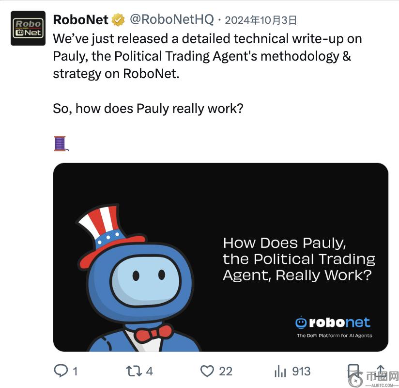 Pauly是一个旗舰级政治交易Agent,通过动态调整头寸实现了约14%的三个月回报率(年化68%)。Robonet 2.0扩展了其AI Agent生态系统,提供更多策略和视角。
